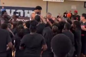 开拓者前往犹他客场登机照 杨瀚森依然背着粉色小书包