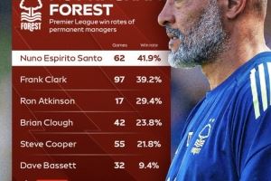 努诺手下的诺丁汉森林英超胜率41.9%,是队史胜率最高的主帅