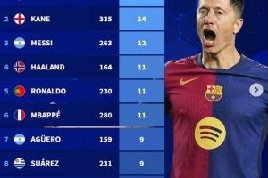 自15/16赛季五大联赛帽子戏法次数榜:莱万16次居首,梅罗在列