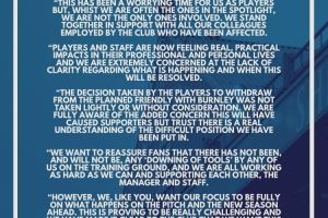 球员决定退出原定与伯恩利的友谊赛,并非草率之举或缺乏考量。我们完全清楚这会增加球迷的不安情绪,但我们相信,大家能够理解我们所处的艰难境地。